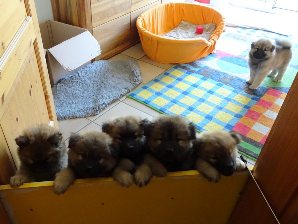 Voller Tatendrang wird nun jeder Tag angegangen. Alles wird erobert und verteidigt, erklommen und wenn möglich, zerstört. Kein Schuhband bleibt zu, kein Hosenbein nicht gezerrt. Besonders am Abend fliegen die Fetzen. Da flitzen plötzlich zwei Fellkugeln durchs Bild, um dann im hohen Bogen ins Zimmer zu fliegen und im Bettchen zu raufen.Dann kann es auch schon mal recht laut werden. Trotzdem sind sie immer noch sehr liebevoll miteinander und für einen Rüdenwurf verblüffend friedlich.