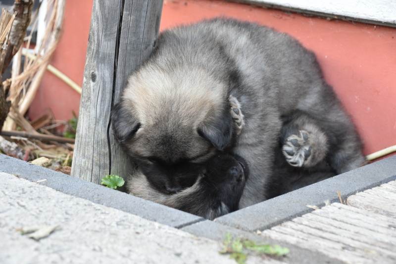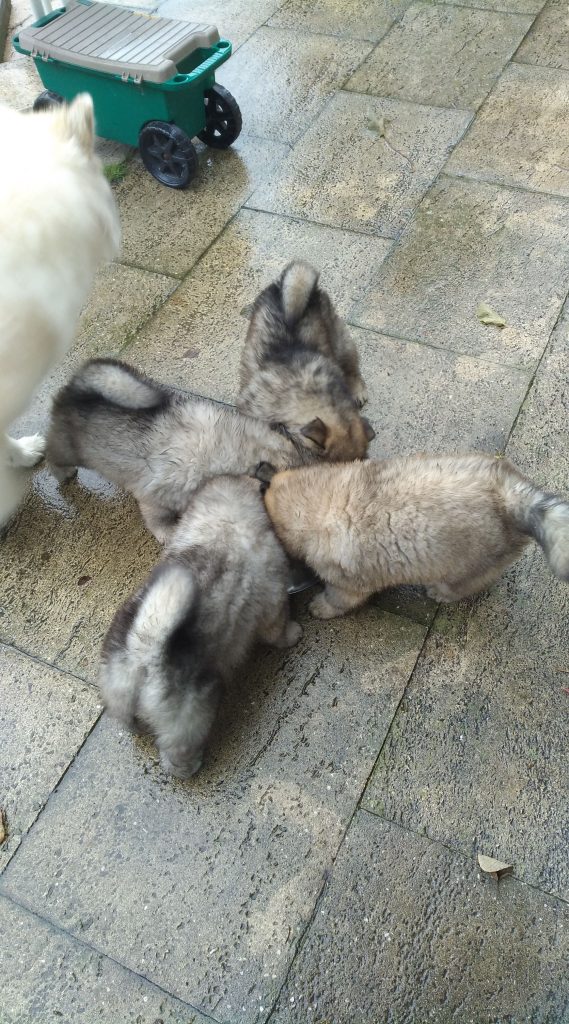 In der sechsten Woche kommt viel Besuch, nicht nur Menschen von ganz klein bis groß, sondern auch der Papa. Die Vier sind richtig gut drauf. Sie wiegen jetzt um die 3 kg, toben mit Spielzeug und nagen an allem. Bela erteilt die ersten Lektionen in Respekt erweisen und Dinge tabuisieren. Man kann sich kaum sattsehen an den zauberhaften Bewegungen und Spielen. Die zweite Wurmkur steht an und wird diesmal schon gekonnter aufgeschlabbert. Und das erste Futter wird eingesogen, als ob sie es schon immer so bekommen hätten.