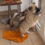 Und wieder regnet es jeden Tag und ist dazu stürmisch und kalt. So müssen die Außenaufenthalte immer wieder abgebrochen werden. Der Fröhlichkeit der Welpen tut das aber keinen Abbruch, zumal sie täglich Besuch bekommen und eifrig bespielt und geknuddelt werden. Freudig schwanzwedelnd kommen sie einem entgegen und ersetzen damit den fehlenden Sonnenschein.